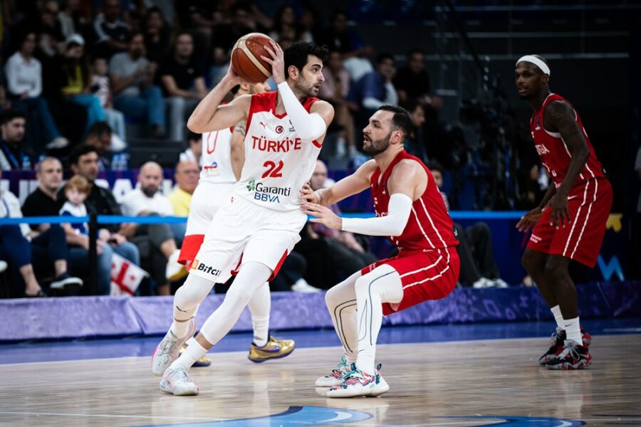 Ketvirtojo kėlinio viduryje akis į akį susirėmė Turkijos ir Sakartvelo krepšininkai Furkanas Korkmazas su Duda Sanadze.
